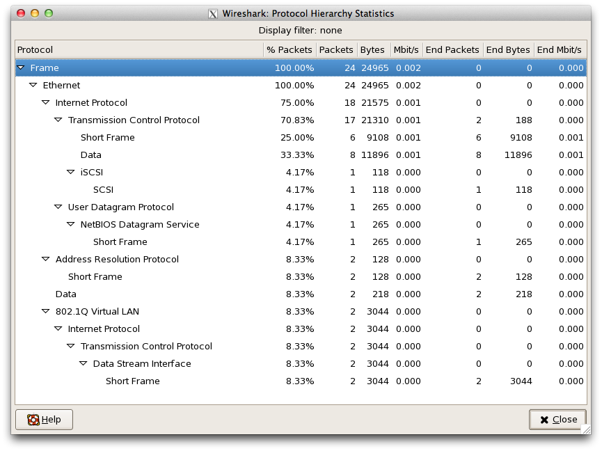 In addition to being able to decode and filter packets, Wireshark has a number of statistical reporting capabilities. The following screen shot shows protocol statistics generated using captured sFlow data: