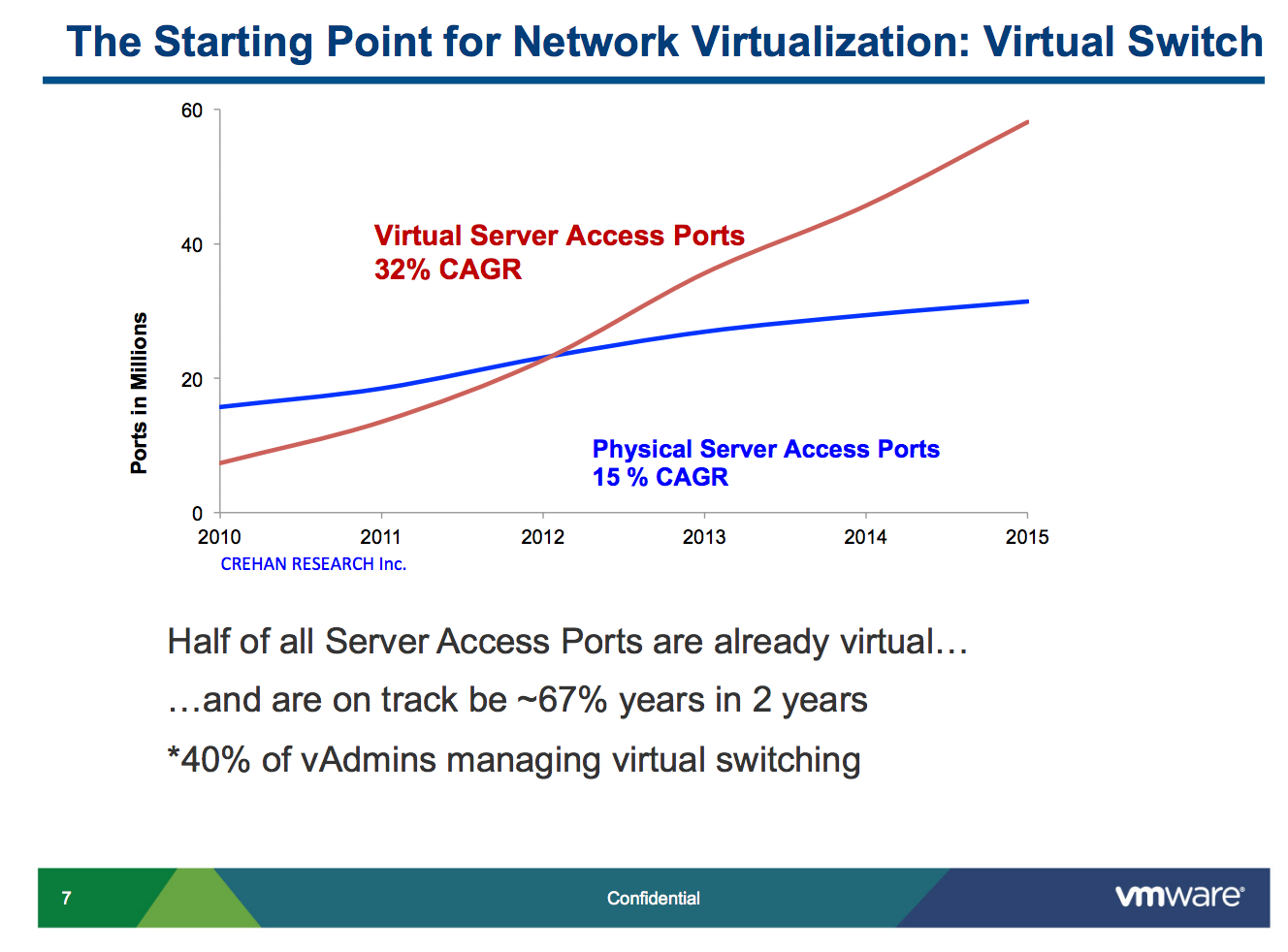 The slide from Bruce Davie's keynote address at Open Server Summit 2013, Network Virtualization: What it is, Why it Matters, shows the rapid transition from a physical edge in which physical servers are attached to physical switch ports, to a virtual edge in which virtual machines are attached to virtual switches. Second generation virtual switches are starting to enter the market, delivering increased performance and integrating support for overlays and network virtualization. In SDN market predictions for New Year: NFV, OpenFlow, Open vSwitch boom, Eric Hanselman, chief analyst at 451 Research states, "The improved scalability of Open vSwitch 2.0 will affect the numerous SDN vendors who use it as an OpenFlow agent on switches or as an endpoint in overlay technologies. These vendors include high-profile players such as VMware Inc. and startups such as Midokura and Pica8."